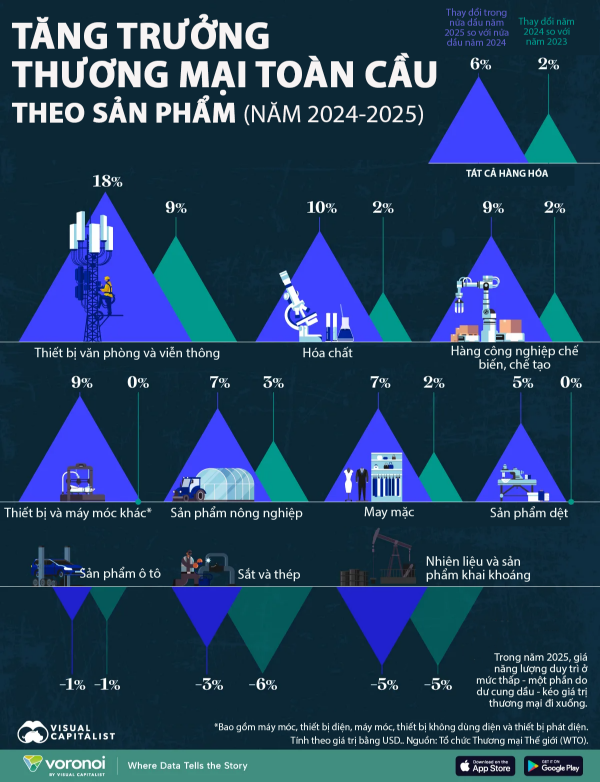 Tăng trưởng thương mại toàn cầu đối với một số mặt hàng chủ lực năm 2025 (08/12/2025)