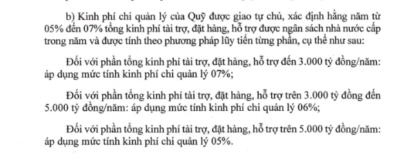 Đối với chi phí quản lý, Quỹ được giao cơ chế tự chủ, dao động từ 5% đến 7% tổng kinh phí tài trợ, áp dụng theo phương pháp lũy tiến. Cụ thể, mức 7% áp dụng với quy mô dưới 3.000 tỷ đồng; 6% cho phần từ 3.000 –5.000 tỷ đồng; và 5% cho phần vượt 5.000 tỷ đồng.