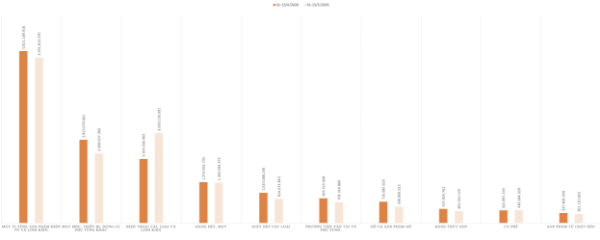 Tuy nhiên, sự phân hóa trong nội bộ nhóm công nghệ cao ngày càng rõ nét. Điện thoại và linh kiện, một trong những mặt hàng xuất khẩu chủ lực nhưng ghi nhận mức giảm sâu 28,78%.