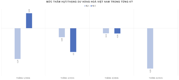 Trong nửa đầu tháng 4/2026, cán cân thương mại âm khoảng 4,25 tỷ USD, mức cao nhất tính theo từng kỳ kể từ đầu năm. Tính lũy kế từ đầu năm, mức thâm hụt này lên gần 7,9 tỷ USD. Điều này cho thấy áp lực nhập khẩu phục vụ sản xuất đang gia tăng nhanh hơn xuất khẩu trong ngắn hạn, đặt ra yêu cầu theo dõi sát diễn biến thương mại trong các tháng tới.